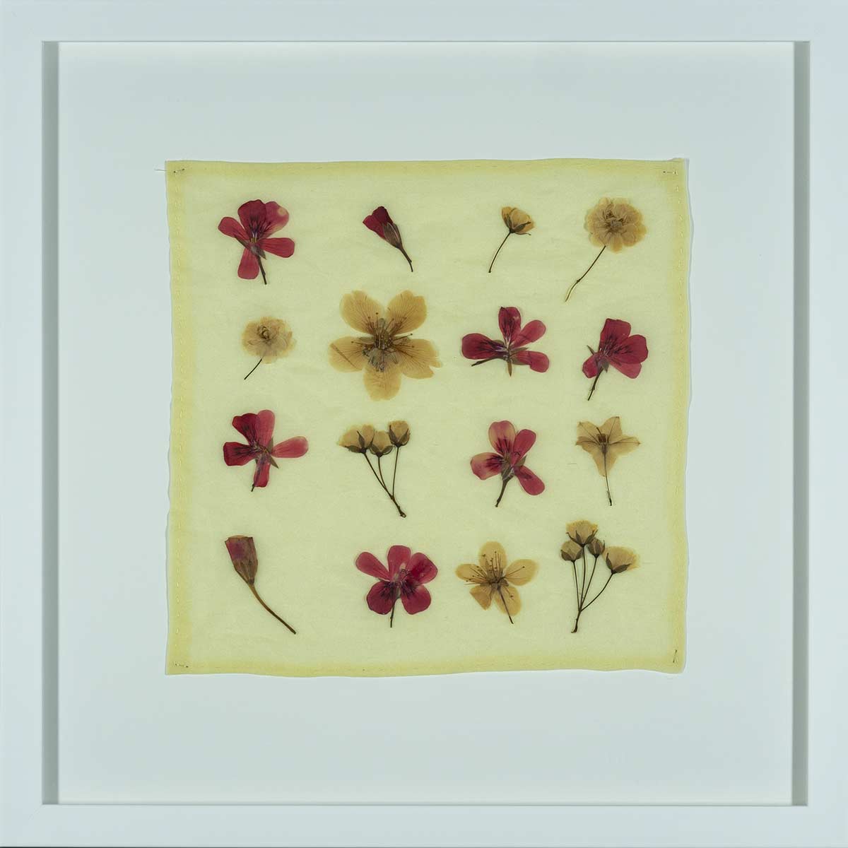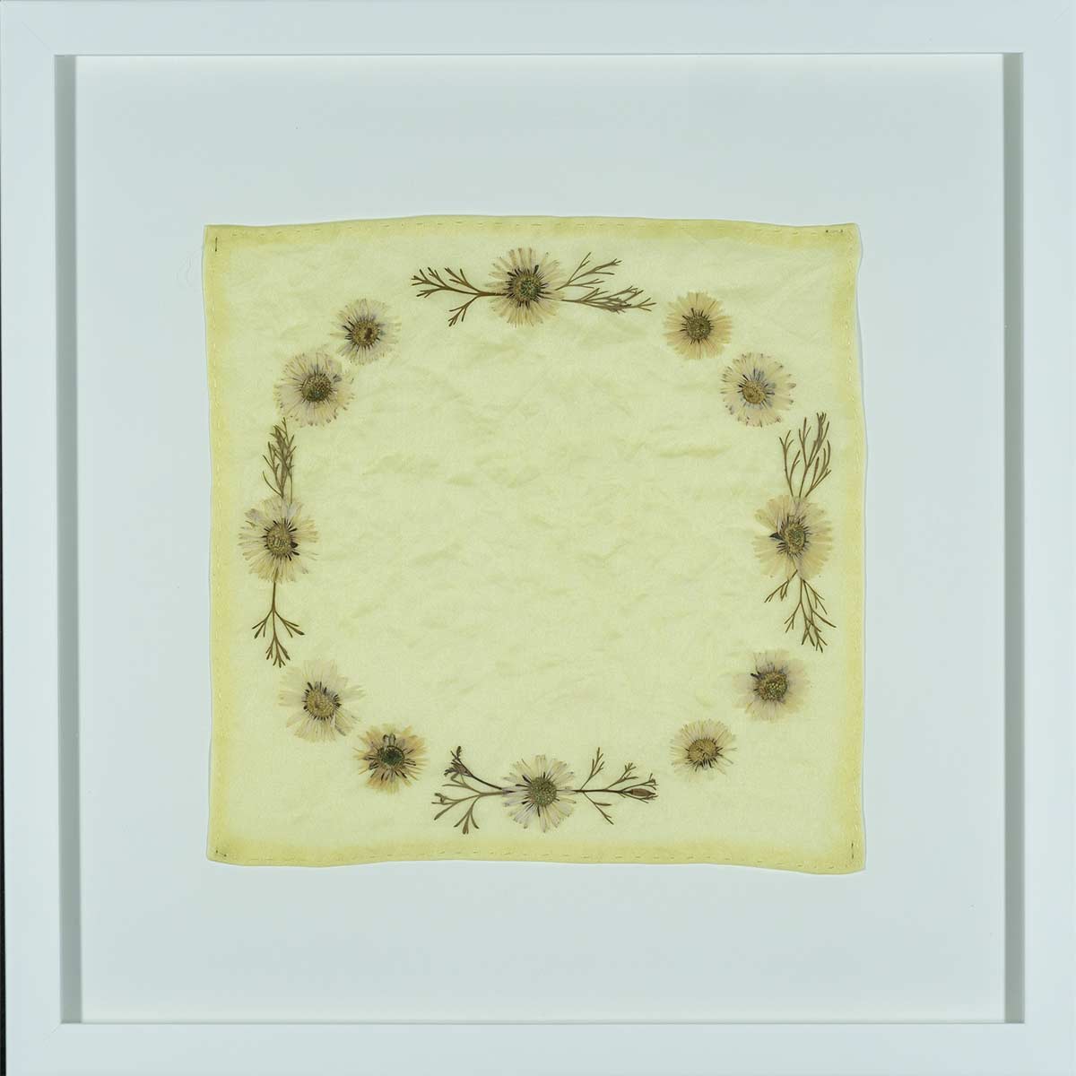8”/20 cm ‘hankies' framed @ 33 cm x 33 cm. Dried flowers glue onto silk, vintage fabric.